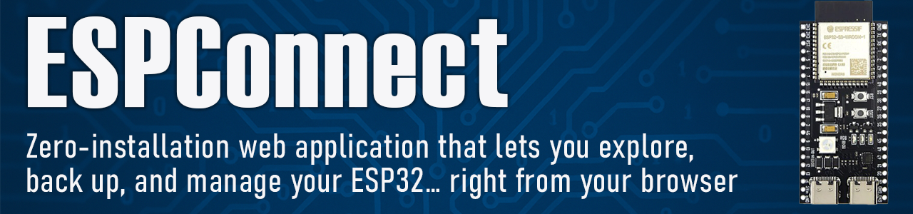 ESPConnect 不需要本地软件安装,通过现代 Chromium(如 Chrome / Edge / Brave)即可直接管理 ESP 系列板卡。它利用浏览器的 WebSerial / WebUSB 能力,与连接的 ESP32 / ESP8266 设备通信,提供从设备信息到固件、文件系统和实时监控的一体化工具。