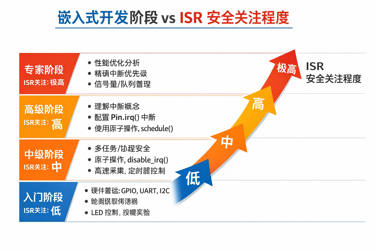 在嵌入式开发中,ISR(中断服务例程)安全性不是一开始就必须深究的内容,而是随着你对系统理解加深和实际项目需求出现时,才逐步成为重点关注的内容。下面我给你梳理一个学习阶段路线和对应关注点: